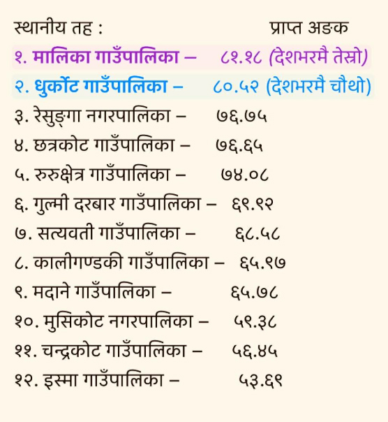" गुल्मीको मालिका गाउँपालिका ८१.९८ अंकसहित तेस्रो तथा धुर्कोट गाउँपालिका ८०.५२ अंकसहित चौथो स्थानमा छन्। यी चार स्थानीय तहले मात्र ८० अंक पार गर्न सफल भएका छन । "गुल्मी – राष्ट्रिय प्राकृतिक स्रोत तथा वित्त आयोगको कार्यसम्पादन मूल्यांकनमा गुल्मीको रेसुङ्गा नगरपालिका देशमै पाचौँ र लुम्बिनी प्रदेशमै पहिलो बन्न सफल भएको छ। बिहीबार आयोगले सार्वजनिक गरेको नतिजाअनुसार रेसुङ्गा नगरपालिकाले ७६.७५ अंक प्राप्त गर्दै लुम्बिनी प्रदेशका ३२ नगरपालिकामध्ये उत्कृष्ट स्थान हासिल गरेको हो।